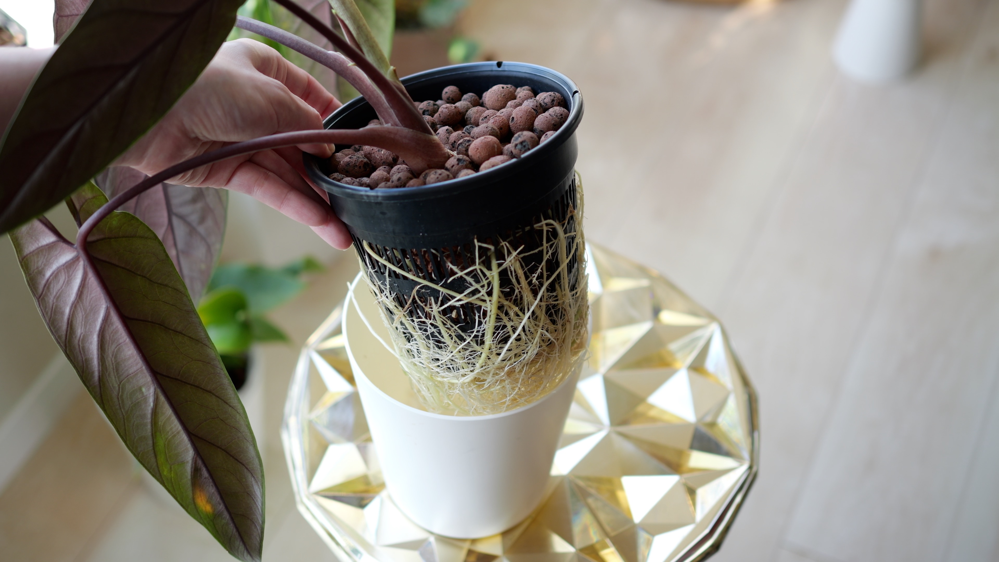 ハイドロボールでアロカシアを育てている場合も、根がたくさん出てきたタイミングで植え替えを行いましょう。